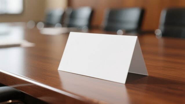 Blank nameplate on wooden conference table in business meeting room for mockup or text.