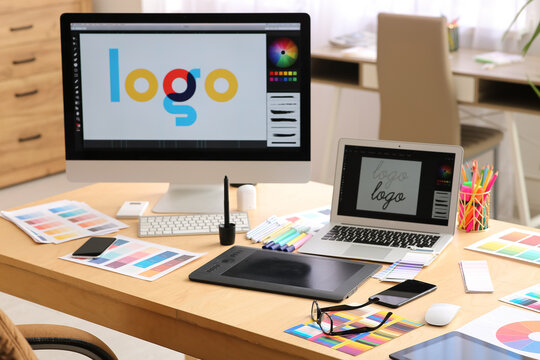 Workspace of graphic designer with modern computer, tablet, laptop and color palettes in office