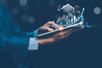 Business professional analyzing interactive tablet with floating data graphs and charts