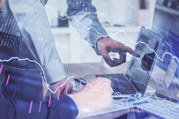Double exposure of graph with man typing on computer in office on background. Concept of hard work. Closeup.