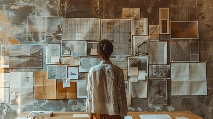 An interior designer presenting a mood board, copy space, concept development theme, ethereal, composite, client meeting room backdrop