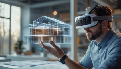 Man interacting with a virtual blueprint of a house using a VR headset. Advanced architectural design and virtual reality technology for project visualization and planning