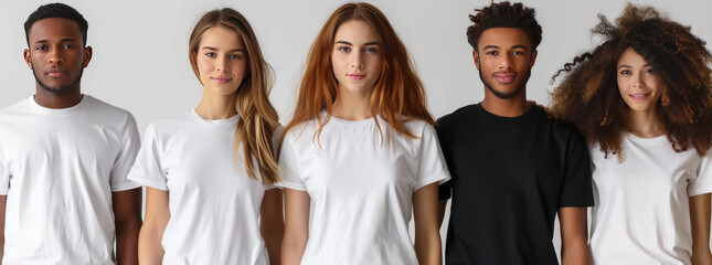 a website banner for a custom t-shirt company, white background, models with different t-shirt designs,generative ai