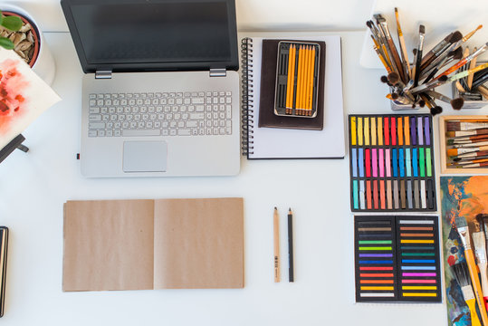 Designer workplace top view. Painter desk with drawing equipment. Home studio for artist.