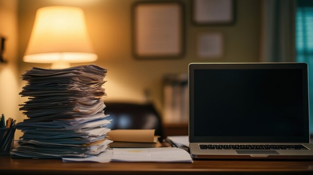 A cluttered desk scene with a stack of papers, a closed laptop, and a warm lamp illuminating the workspace, suggesting a productive atmosphere.