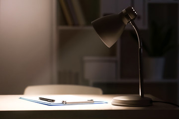 Clipboard with pen and lamp on table in evening