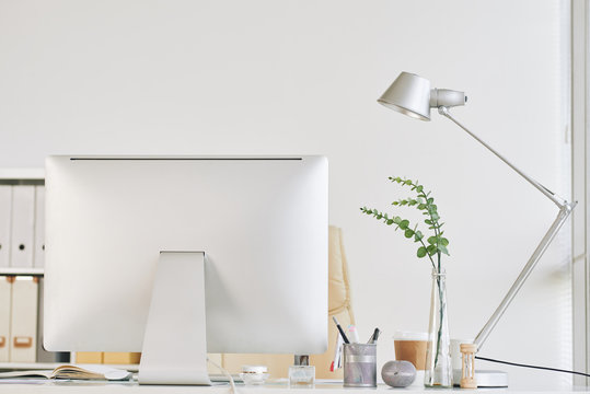 Real photo of white apartment interior with fresh plants, paper rolls in basket, organizer on wall and wooden desk with empty screen monitor and lamp