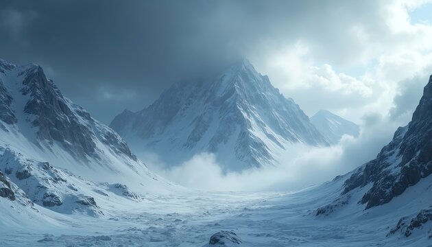 Pristine snowy mountain landscape with dramatic sky