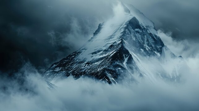 A dramatic snow covered mountain peak emerges from the fog under a twilight sky