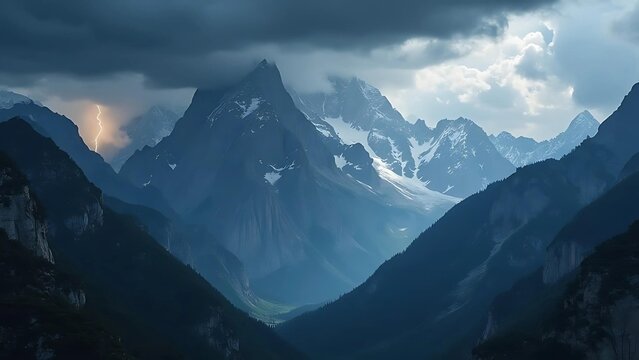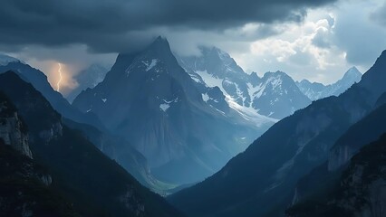 Dramatic mountain scene with snow peaks and brooding clouds