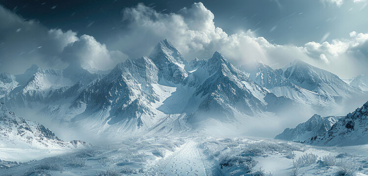 Moody mountain landscape with snow-capped peaks and stormy clouds