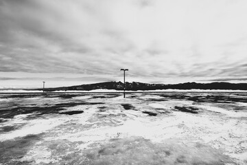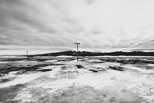 Monochrome winter scene of snow-covered parking lot with street lamps and distant mountain range under heavy overcast sky in remote cold region creating stark minimalist