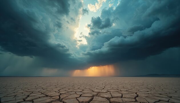 Stormy sky with dark blue clouds above cracked desert. Golden sun rays pierce horizon. Stark earth with tempest creates raw nature background. Arid plain evokes desolation, isolation, intensity.