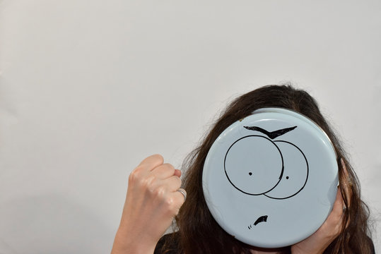 Woman covering face with paper sad emoticon symbol