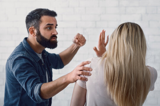 Aggravation of domestic tyranny concept. Scaring woman protecting herself, man in rage beating up his wife