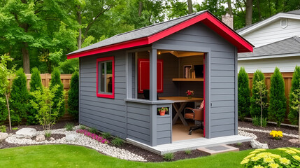 Modern Backyard Studio Shed - Stylish gray shed with red door, perfect for a home office or creative space. Landscaped backyard setting