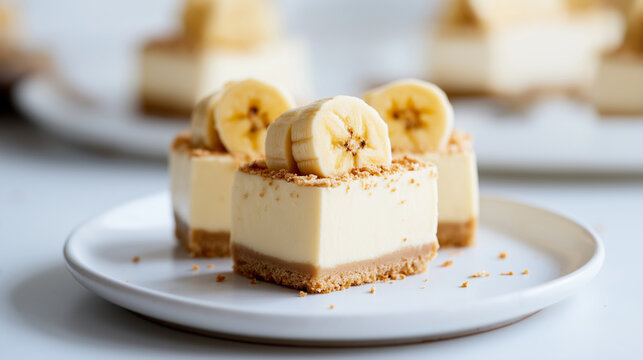Creamy banana dessert squares beautifully arranged on a white plate for a sweet treat at a gathering.