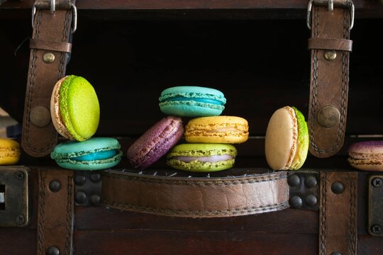 Colorful macaroons on a brown leather bag