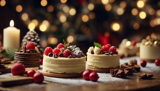 Festive christmas desserts and decorated tree background