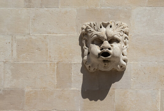 The face protrudes from the white stone wall. Background with copy space. Dubrovnik Croatia. Selective focus