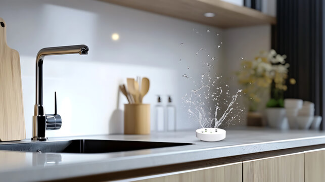 A smart water leak detector, kitchen with device detecting water leaks and sending alerts, Home-tech style