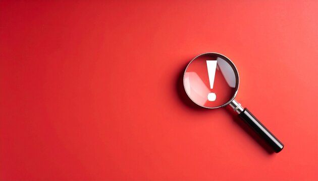 Magnifying glass revealing exclamation mark on red surface symbolizing urgency and alert
