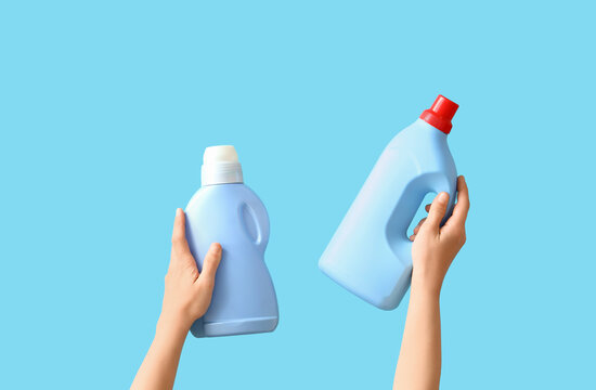 Collection of various laundry detergent bottles in different shapes and colors isolated on a transparent background showcasing design variations and packaging options.