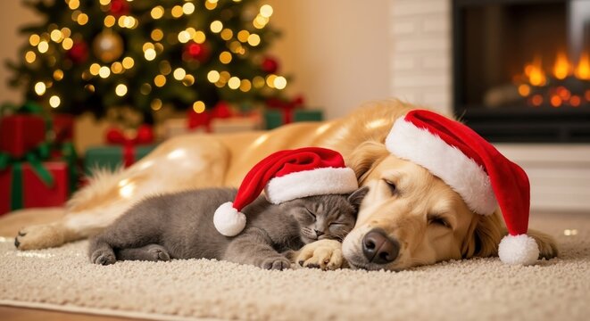 Cute dog and kitten sleeping together with Santa hats for Christmas. Golden retriever and cat friends cuddling by a cozy fireplace. Holiday pets friendship concept.