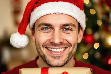 Close-up of a smiling man wearing a red Santa hat while holding a wrapped gift