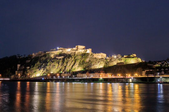 Ehrenbreitenstein Fortress on the Rhine opposite the Deutsches Eck at night with lighting in Germany, Koblenz on 21 March 2024