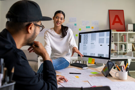 UX UI designers discussing and brainstorming on wireframes for a website and mobile app prototype, in the concept of website and mobile application design concept.