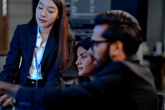 Coworkers analyzing digital code collaboration in modern office