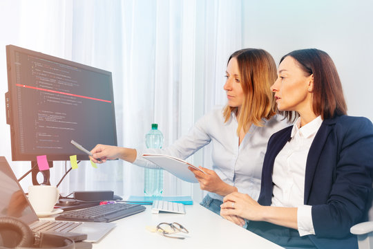 Profile photo of it specialist two serious guy lady business people night together coworking watch direct monitor errors bugs writing interface back-end java script code office indoors