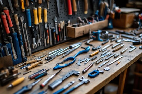 Cluttered workbench with tools in craftsman's studio