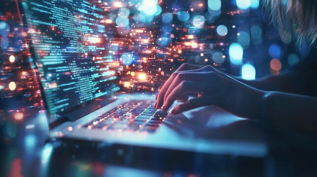 A person types on a laptop, with digital code and data graphics overlaying, symbolizing technology and programming.
