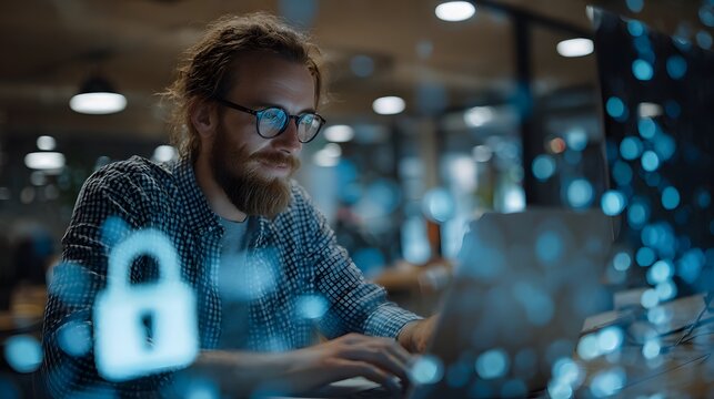 Man with beard wearing glasses typing on a laptop with digital security overlay in a modern office