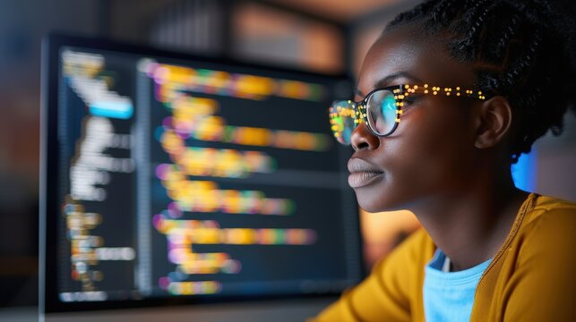 Woman Engaged in Coding and Data Analytics With Programmed Hologram and Cybersecurity Interface