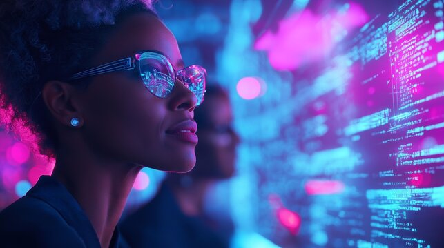 Female developer, woman collaborating on futuristic technology projects, digital screens displaying holograms and coding. The innovation, technological advancements, tech business. neon light