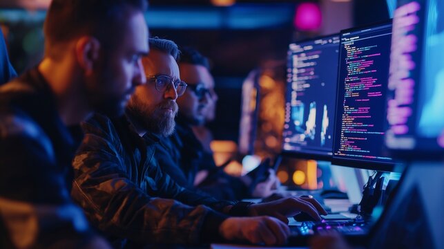 A diverse team of developers, man collaborating on futuristic technology projects, digital screens displaying holograms and coding. The innovation, teamwork, technological advancements, tech business