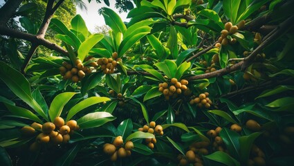 Lush mango tree with ripe fruit in sunlit field