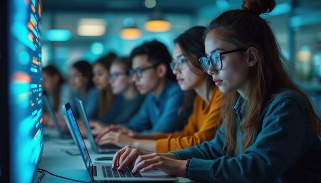 Young students concentrate coding laptops. Digital interface graphics display data on screen. Teamwork, collaboration in futuristic classroom developing software, learning computer science. Youthful