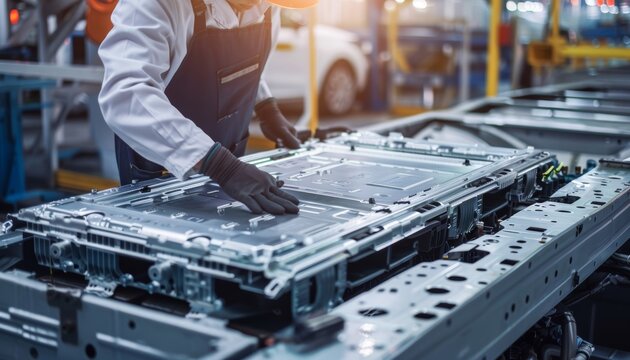 Chinese engineer developing electric vehicle battery modules in ev manufacturing plant