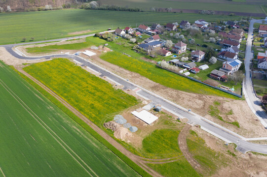 Aerial view of construction site with new roads. Family houses as example of real estate development in suburbs.  Construction of residential houses in the microdistricts. Space for text. Cityscape