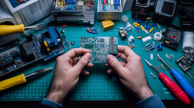 Technician examining a printed circuit board at a workbench surrounded by electronic tools and components.