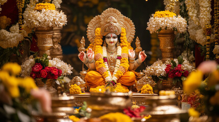 Lavishly decorated statue of Goddess Durga during Vijayadashami, surrounded by floral decorations and golden lamps, Ai generated images