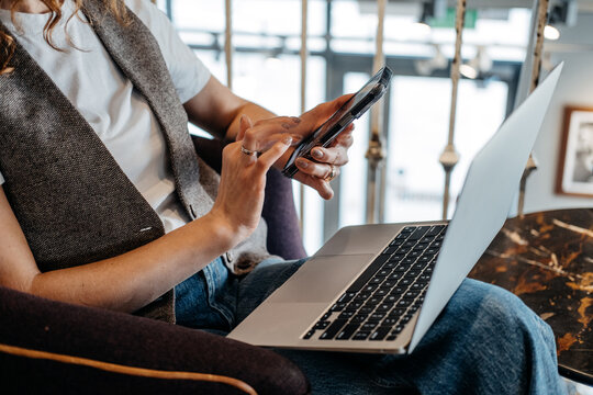 A close-up of a young womans hands as she interacts with her smartphone while working on a laptop. Cross-platform work habits, device integration, cloud-based tools, digital ecosystem