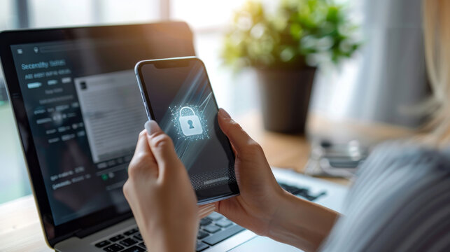 A person's hand is interacting with a smartphone displaying a cybersecurity lock graphic, with a laptop screen visible in the background.
