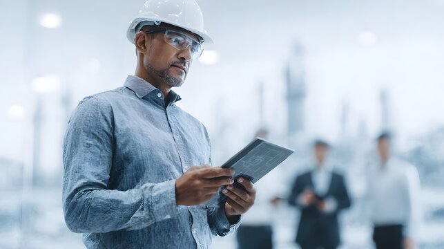 Focused engineer in a hard hat and safety glasses reviews digital blueprints on a tablet standing in a bright modern industrial facility