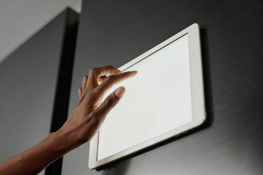 Low angle shot of unrecognizable female hand touching screen of tablet on fridge door