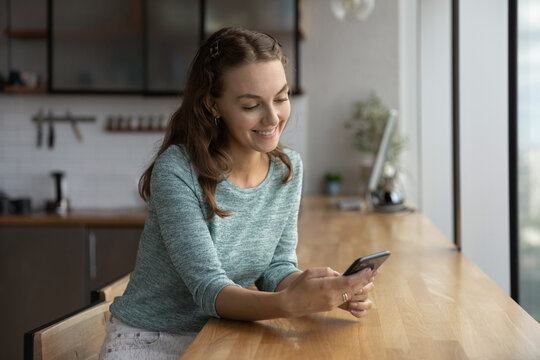Smiling millennial Caucasian woman sit at desk at home use modern cellphone gadget texting messaging online. Happy young female client or user hold smartphone browse wireless internet on device.